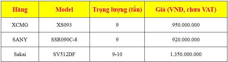 ✯ 2. Bảng giá máy lu bánh thép 9 tấn (tham khảo 2025)
