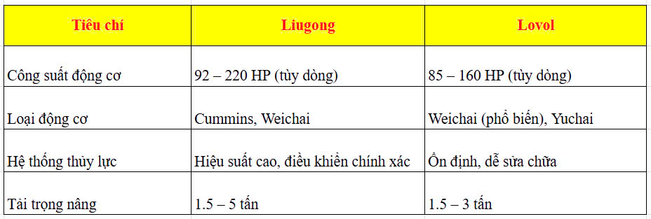 ➡️ Liugong có dải công suất rộng và hiệu suất cao hơn. Lovol phù hợp công trình vừa, không yêu cầu tải lớn.