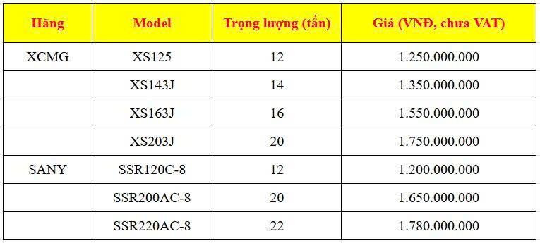 ✯ 2. Bảng giá xe lu bánh thép XCMG và Sany (tham khảo 2025)