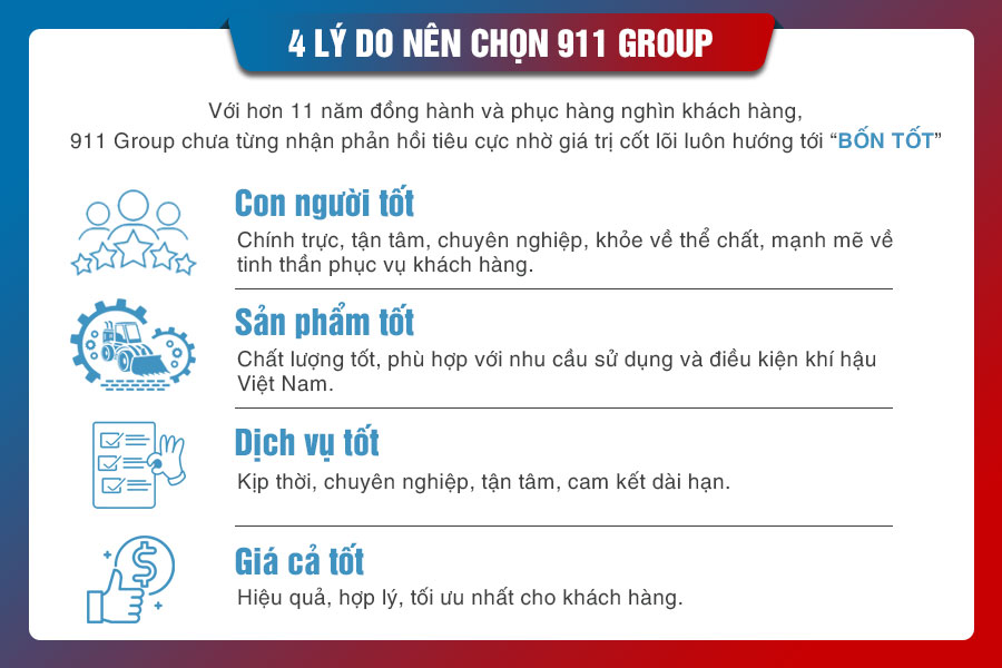 Tập đoàn 911 là cái tên không còn xa lạ đối với các nhà đầu tư thiết bị máy móc công trình ở Việt Nam. Hơn 11 năm qua, 911 Group luôn nỗ lực không ngừng để phát triển lớn mạnh không chỉ ở trong nước mà còn cả trên thị trường quốc tế. Trở thành đối tác chiến lược của XCMG, Tập đoàn 911 mong muốn mang tới cho khách hàng cả trong và ngoài nước những sản phẩm tốt nhất với chi phí hợp lí nhất.