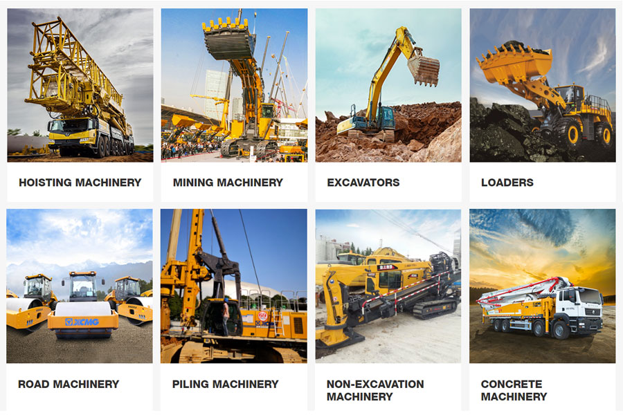 Các dòng sản phẩm chính của XCMG bao gồm 16 danh mục và 3 thành phần chính (thủy lực, truyền động và điều khiển điện tử), bao gồm xe cần cẩu, máy xúc đào, máy xúc lật, xe bơm bê tông, máy khai thác, và máy vận chuyển, máy đường bộ, xe đặc biệt, máy làm việc trên không, máy đóng cọc, máy móc cống rãnh, máy móc đường hầm, xe môi trường, máy móc an toàn cháy nổ, máy khoan và khai thác năng lượng, máy móc cảng và hơn thế nữa.