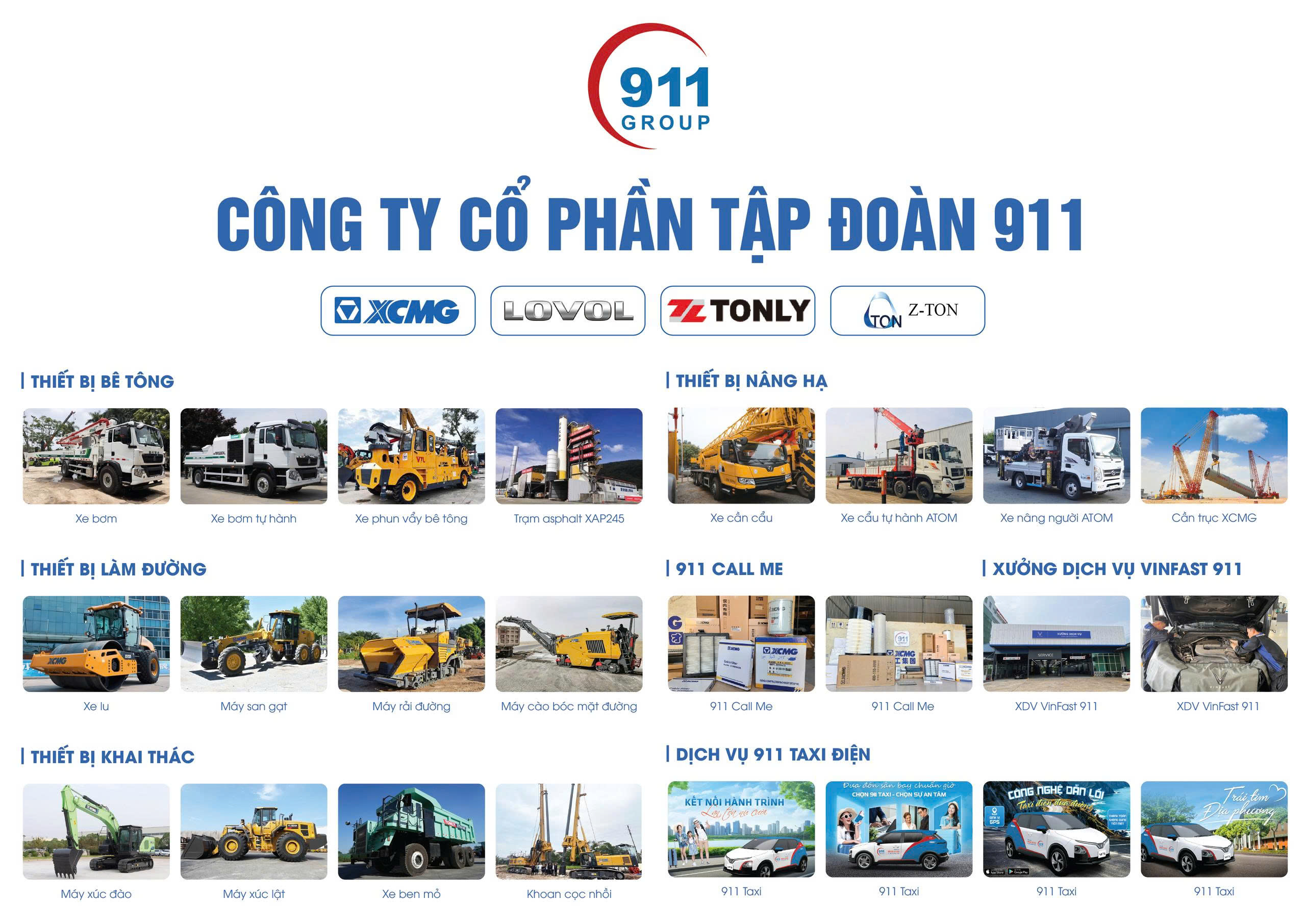 Hiện nay, Tập Đoàn 911 là đại lý kinh doanh & phân phối chính thức các dòng máy công trình, thiết bị vận tải và nâng hạ, bao gồm: