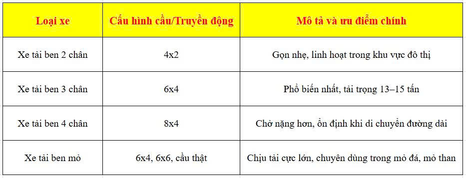 ✯ 2. Phân Loại Xe Tải Ben Phổ Biến